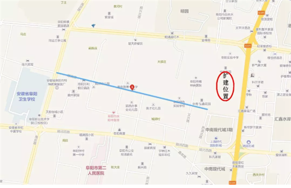 扩建项目建设地点位于阜城人民西路南侧、顺昌路北侧、颍西路西侧,现校区的南侧(商厦时代广场后面),项目总占地面积共计37308平方米(约55.96亩),总建筑面积23000平方米。