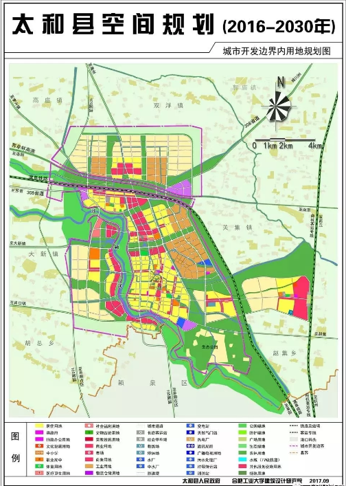 “一轴四带”:“一轴”指G105城镇发展轴,“四带”指沿道路太和西部干线(S449)、太和北部干线(S308)、太和东部干线(S252)、G329形成的城镇次要发展带。