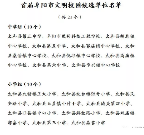 根据市文明办《关于开展第一届阜阳市文明校园评选活动的通知》(阜文明办﹝2018﹞37号)精神,全县各乡镇及县直有关单位按通知要求广泛宣传发动、积极组织申报、严格初审把关;在各乡镇各单位推荐申报的基础上,县人大、县政协、县文明办、县教育局组成联合考评组,进行了检查验收,为体现公开、公正、公平原则,现将太和县第三中学、太和县大新镇王大小学等20个“首届阜阳市文明校园”拟推报单位予以公示,接受社会各界和广大市民监督。