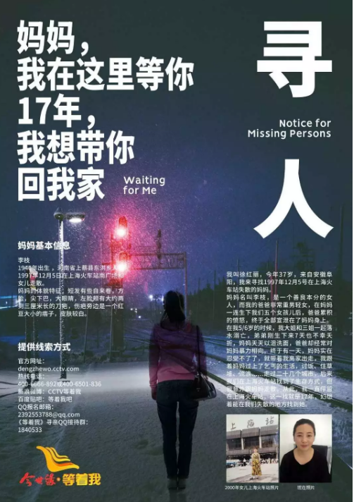 李枝女士,1997年12月5日,您的孩子徐红丽与您失散于上海火车站,她在等您回家,如果您能听到,如果您能看到,请立即与我们联系。