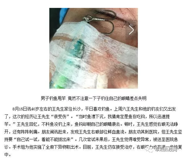 7月17日下午17点40分左右阜阳市临泉县人民医院眼科来了一名特殊的病人一枚鱼钩竟挂到了他的右眼上据了解,患者曾某当天在河边捡瓶子时,不巧的一幕发生了:旁边一名钓者的鱼钩甩到了他的右眼上。值班医生对患